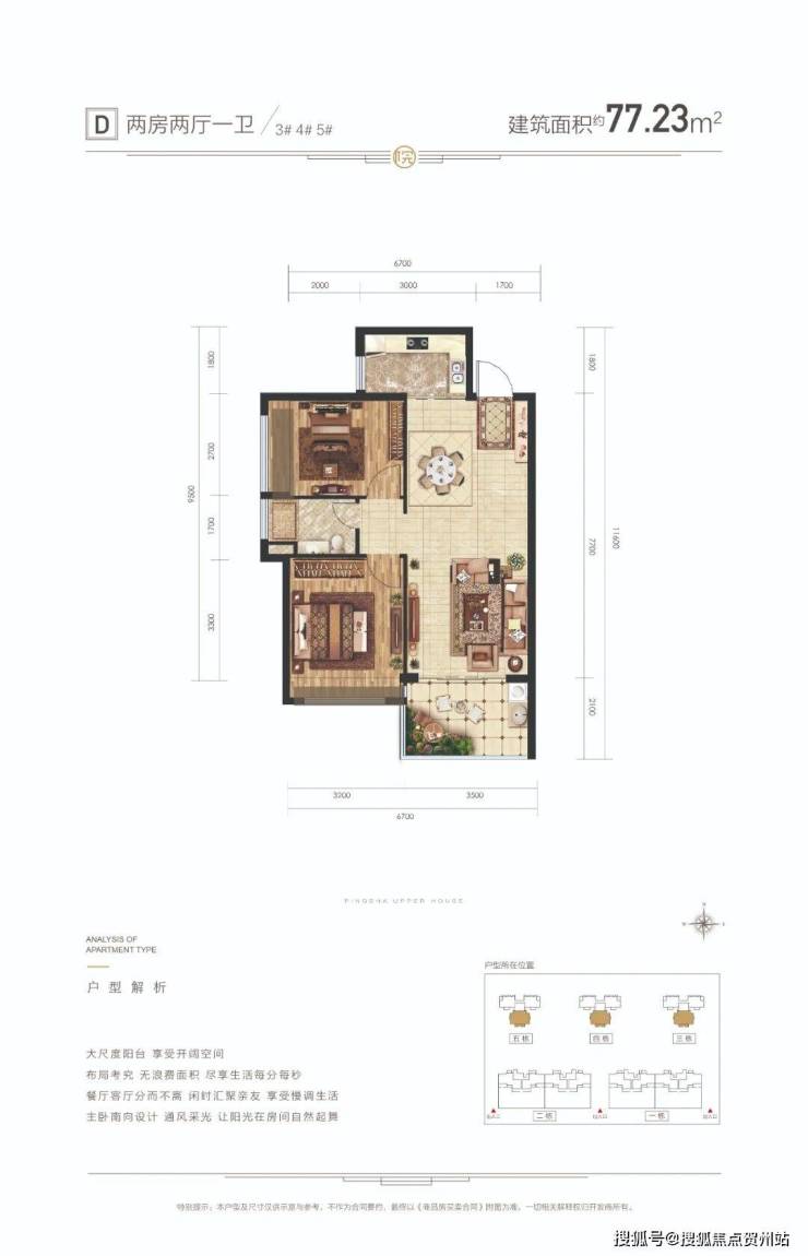 D户型面积:建筑约77㎡ 2房2厅1卫