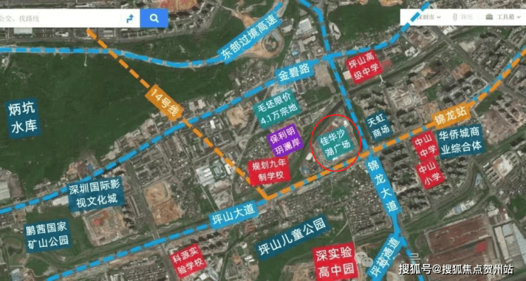 佳华沙湖广场项目位于坪山区坪山大道与锦龙大道交汇处西北角(在建14号线锦龙站旁),项目是包含商业、办公/公寓、住宅、幼儿园于一体的大型综合体,总建面超62万㎡。隔壁是深业国际东城、力高君御国际等住宅区。