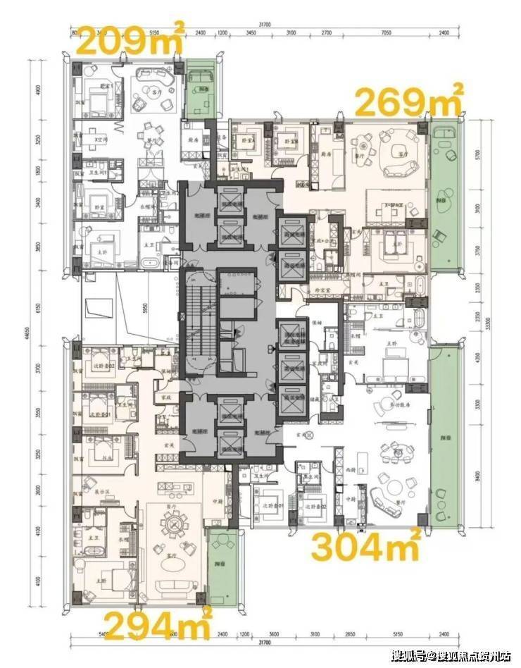 高区42F起(150-200米)是约370-375-403㎡4+1房五卫+家庭厅+家政套间;