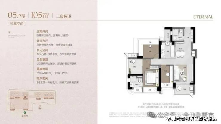 105㎡3+1房两厅:西南朝向可看花园,灵动“+1”房空间可灵活调整使用场景,满足家庭成长需求。
