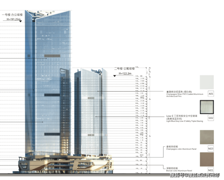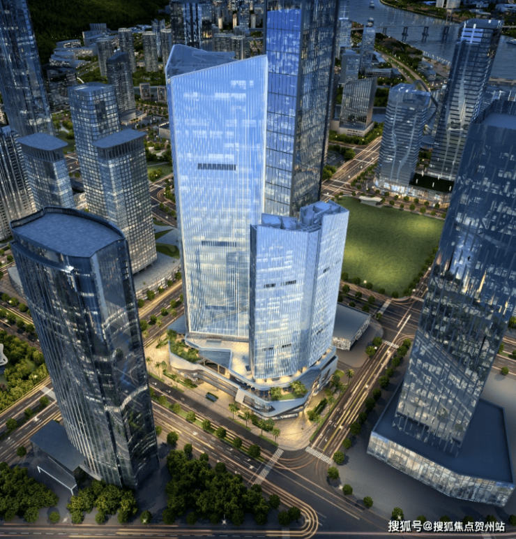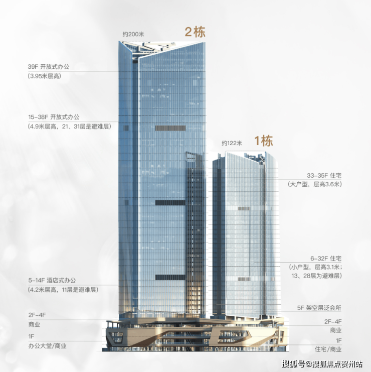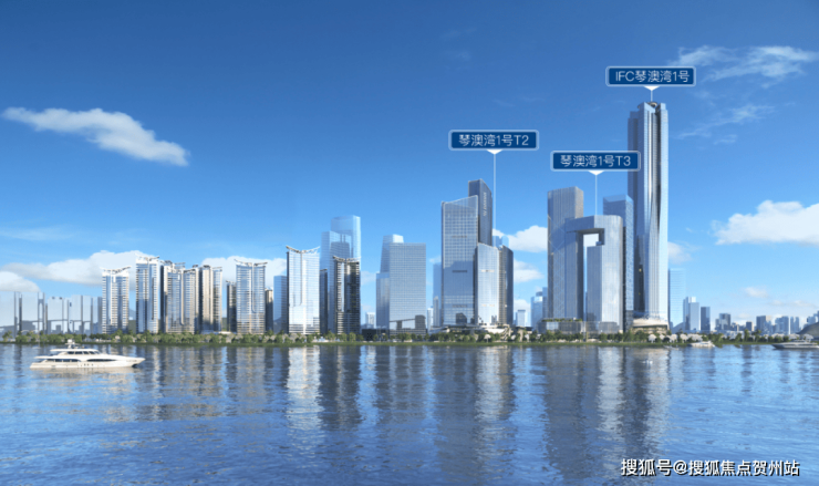 琴澳湾1号“全新一代居住形态”:集办公、住宅、商业于一体的高端综合体,包含约200米高的办公塔楼、约122米住宅塔楼以及4层商业裙楼。