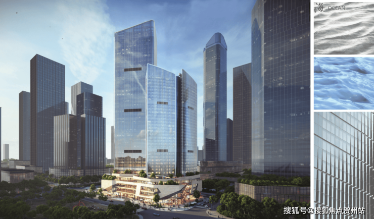 外立面概念源自扬帆随风波动的跳跃型态,融入独特海浪曲线,用建筑语言表达于建筑立面的纹理中: