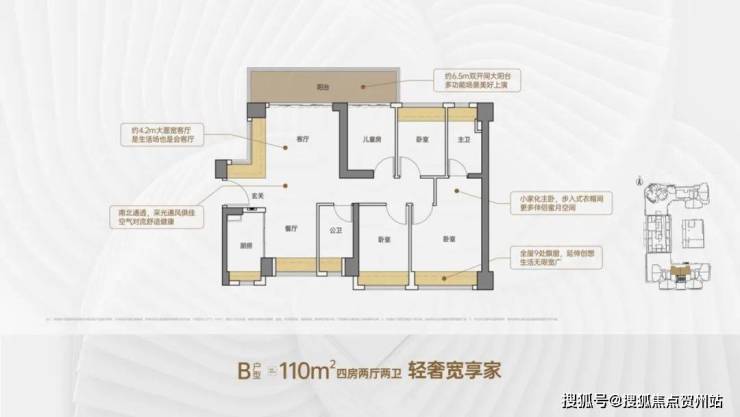 竖厅格局,客厅3.5米开间,LDKB一体化,S墙设计预留冰箱卡槽位,客厅连接次卧出5.9米长的大阳台,主卧双面飘窗,次卧270°转角飘窗,全屋6面飘窗,U型厨房,卫生间干湿分离。