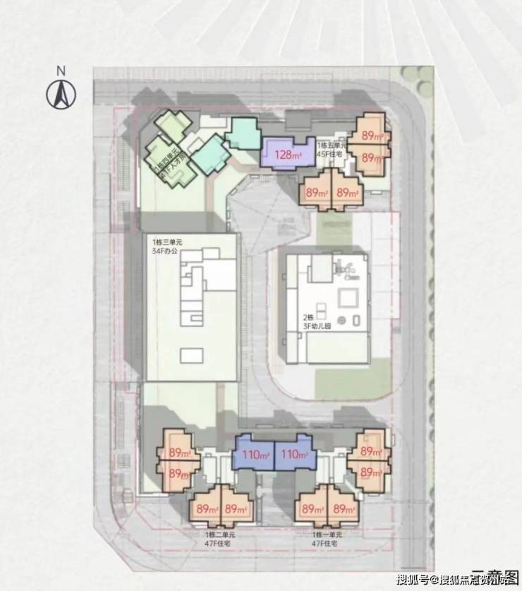 总占地面积约1.36万㎡,共由4栋总高44-47层的住宅+1栋34层的办公组成:其中,1栋1、2单元为47层住宅,5单元为45层住宅,约615套住宅(含50套回迁房);1栋4单元为41层人才房,共180套人才房;1栋3单元为34层写字楼;2栋规划为3层幼儿园。