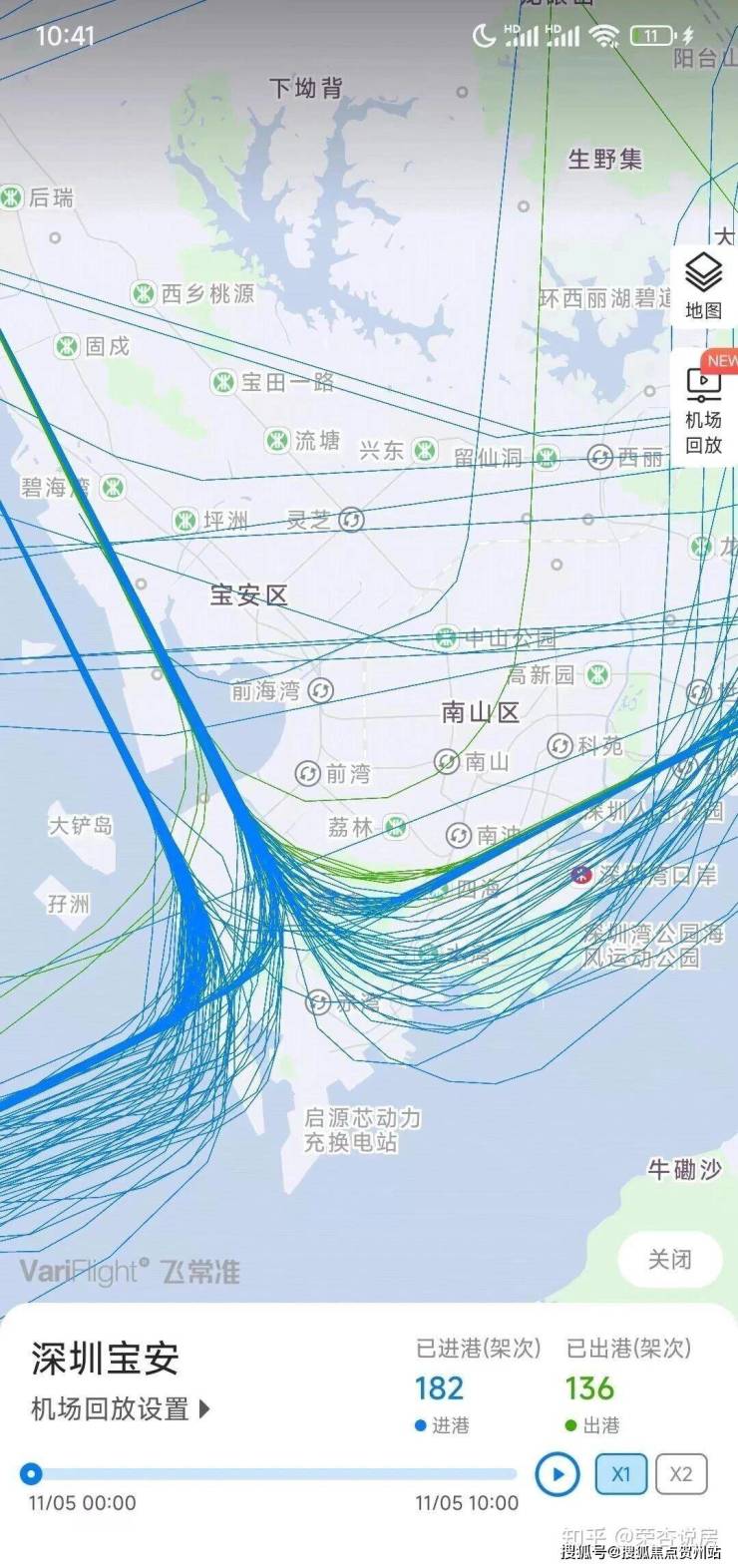 下图是深圳机场某一时间段的航线图(蓝线为进港、绿色为出港),碧海、前海、赤湾都处在密集的航线下,特别是碧海和沙井临海区域,离机场太近,起飞降落面临的影响都是最大的。