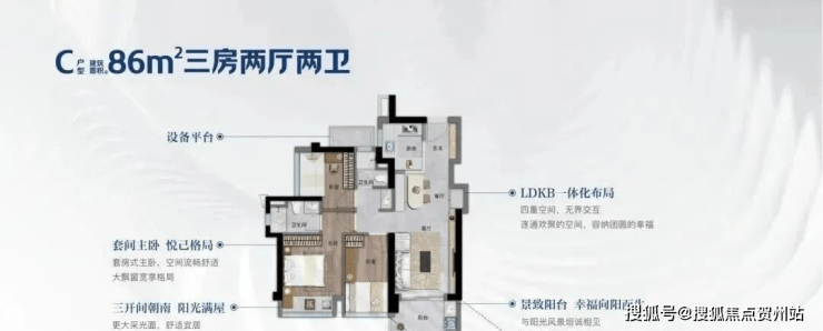 86㎡的3房2厅2卫,设计的是经典竖厅格局,客厅3.2米开间,入户玄关八宝库,LDKB一体化,S墙设计预留冰箱卡槽位,动静分区,三开间朝南,U型厨房,公卫三段式分离,还送1个设备平台,得房率约75.9-76.6%(不含赠送),西南或东南朝向。