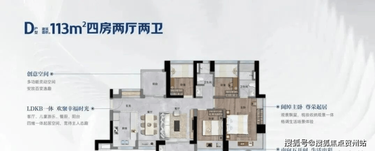 113㎡的4房2厅2卫,1栋1/2单元07户型,设计的是横厅南北通透格局,进门入户玄关,客厅5.4米开间,LDKB一体化设计,五开间朝南,南北双阳台也可以改5房,U型厨房,公卫三段式分离,得房率约75.9-76.6%(不含赠送),阳台主朝西南或东南向。