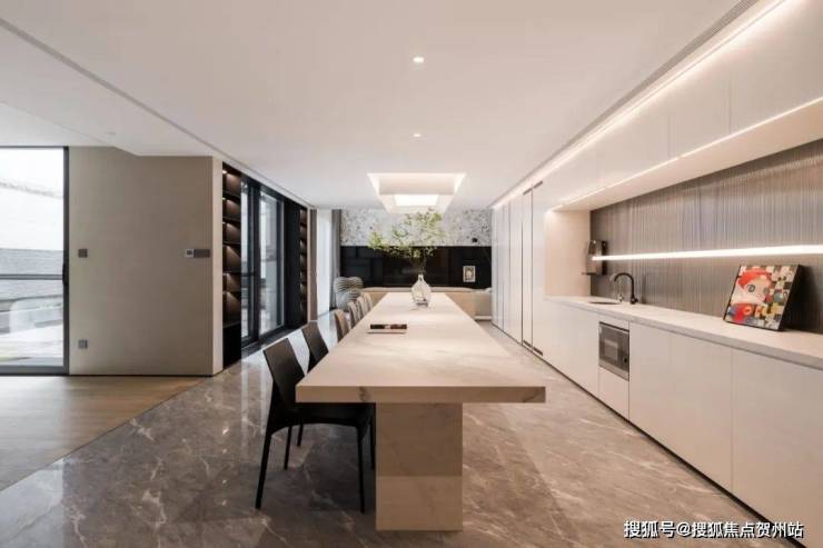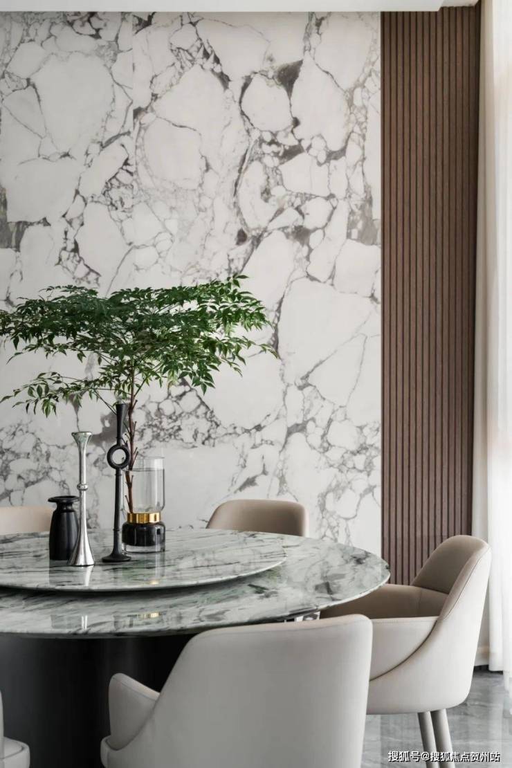 一楼的餐厅以接待为核心功能实用,开放式格局餐厅与客厅相互串联而富有层次感,视觉通透让整个空间宽敞,大气;大花白大理石桌面线条优雅,恰似被自然晕染过的简约流畅,家人就餐以及日常社交都可以在此进行,厨房空间清爽明亮,推拉门设计使得开放与封闭可自由切换,实用的同时打破厨房与外部交流的屏障。