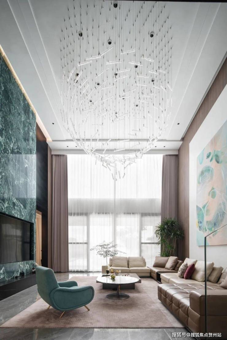 家庭厅的高挑空以豪宅客厅的空间氛围加以打造,顶部不再是具象的灯,配以星星点点的水晶吊灯,如流云、如星空,玲珑剔透,光影斑驳。