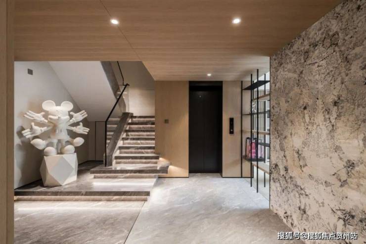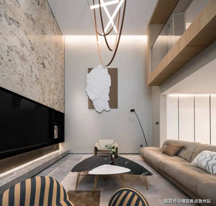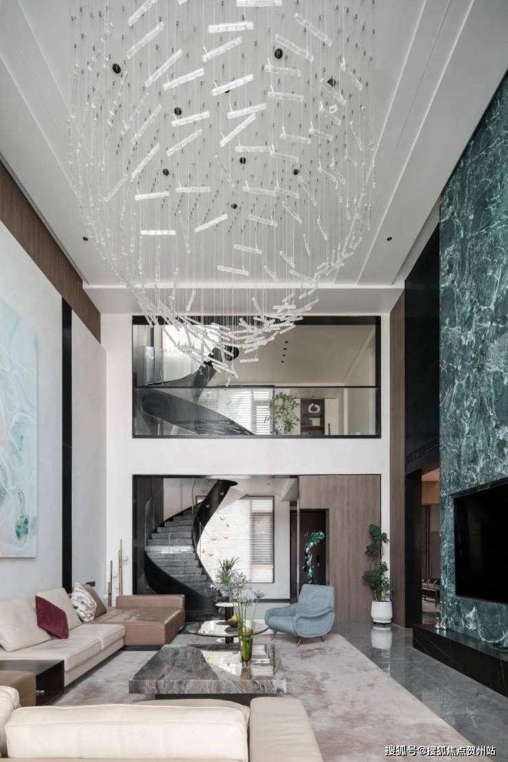 一层入目增加了开放的休闲娱乐区,让过渡空间充满了想象,柜体细节处灯光设计,留白转折拉开层次,或坐或躺也是自在其中。挑空之下,流线型吊灯轻垂错落有致,大理石肌理垂直蔓延,在这里,场景交织下,互动重塑空间意趣。
