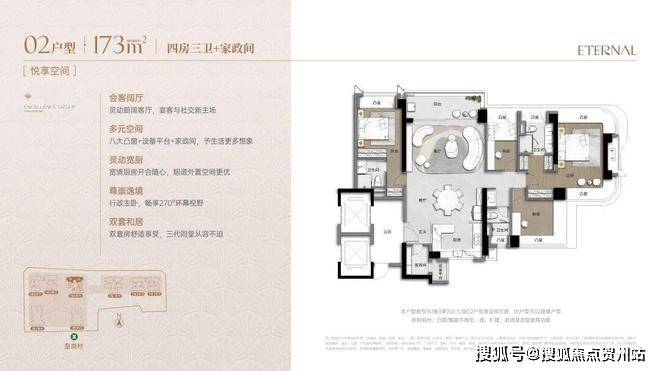 采用双龙抱珠格局,灵活适配成长型家庭。LDKB一体式布局,配备270°环幕主卧套房、U型厨房及七大飘窗,空间动静分离,实用且可变。