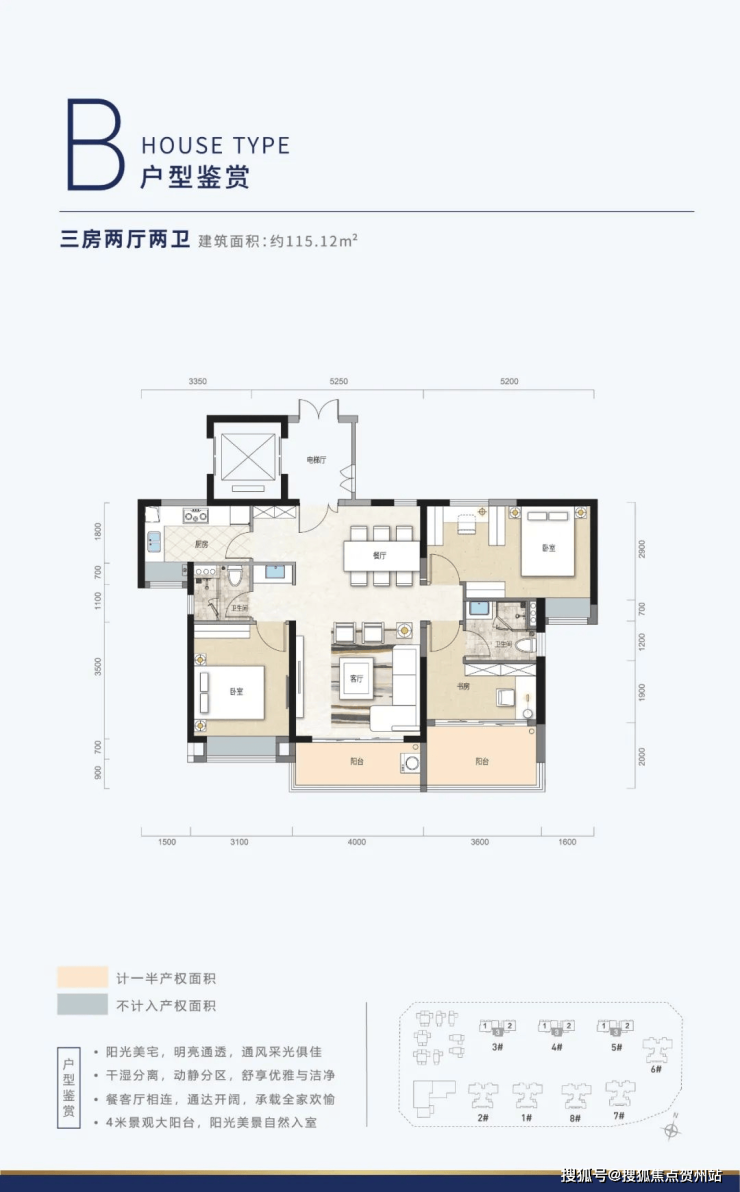B户型,建面约115㎡三房两厅两卫