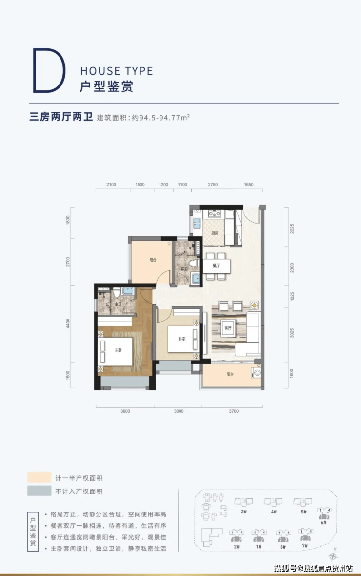 D户型,建面约94㎡三房两厅两卫