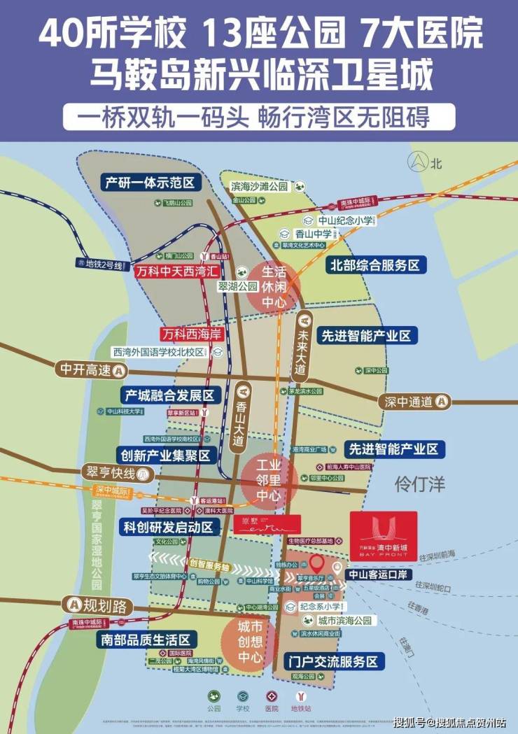 作为海(中山客运口岸)、陆(深中通道)综合枢纽,通过综合开发打造计容建面约175万㎡集口岸、会展、文旅、商业、酒店、办公等产业与社区功能于一体的大型口岸综合体,以一座“超级大城”凝聚马鞍岛多个顶级配套。
