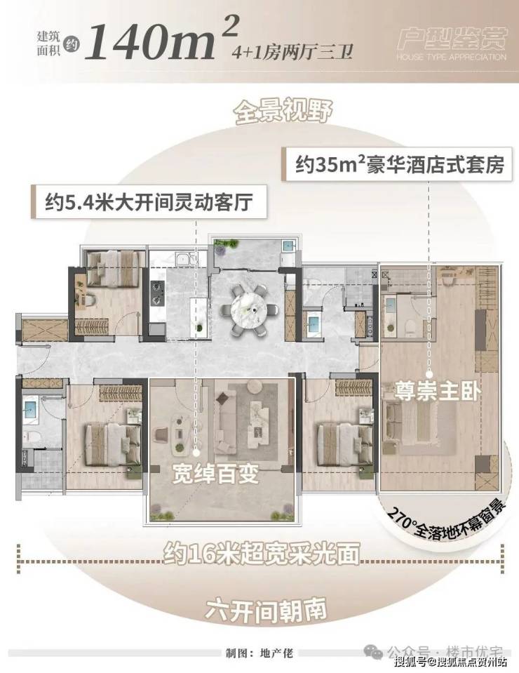 ——建面约140㎡4+1房两厅三卫,实用率超100%。