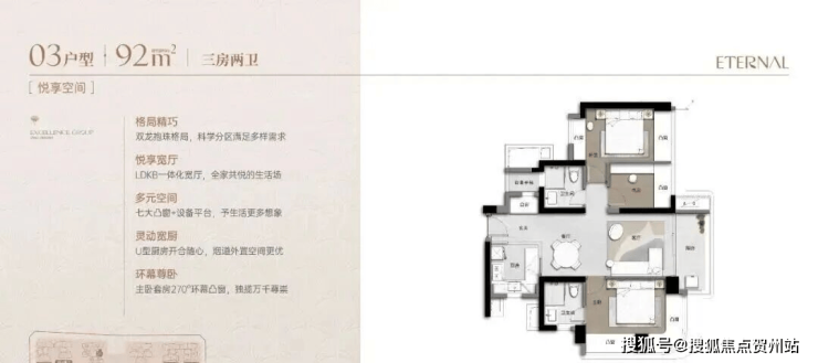 92m²的3房2厅2卫,设计的是双龙抱珠格局,客厅3.2米开间,LDKB一体化宽厅,主卧套房270°环幕凸窗,七大凸窗+设备平台,U型厨房,卫生间干湿分离,得房率超90%(包含赠送),阳台实测6.54㎡正东朝向。