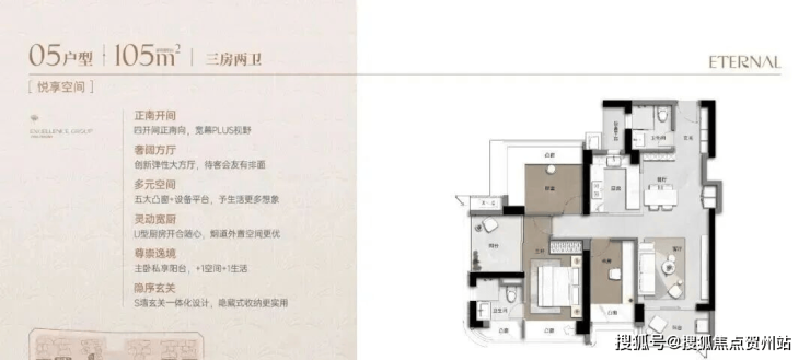 105m²的4房2厅2卫,设计的是经典竖厅格局,客厅3.4米开间,LDKB一体化大方厅,S墙设计预留冰箱卡槽位,四开间朝南,动静分区,五大凸窗+设备平台,U型厨房,卫生间干湿分离,得房率超90%(包含赠送),阳台实测5.04㎡正南朝向,看皇岗公园。