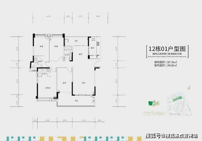 12栋两梯三户,建面约187㎡四房双套间户型。