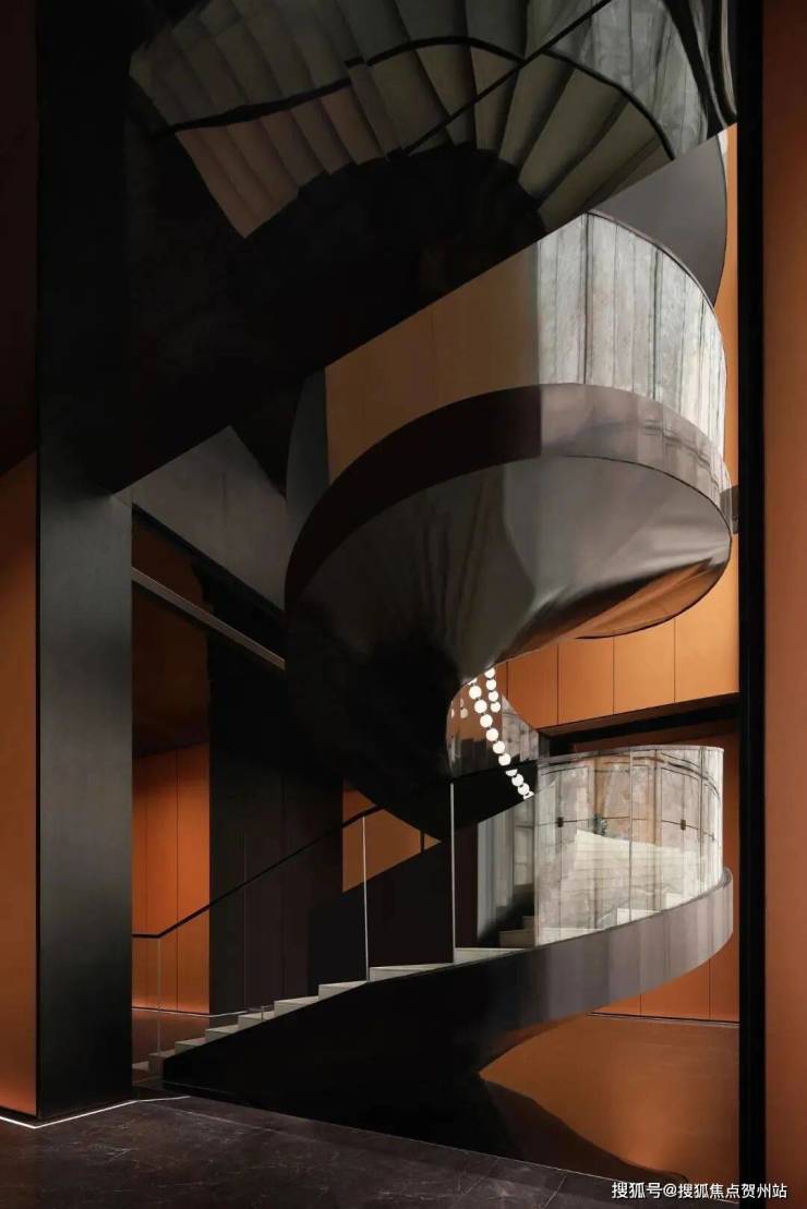 行至旋转楼梯处,浓烈的橘红与黑色碰撞对比,设计师将专属于这种色系的视觉块面有机排布,继续引导空间中消费者的神经走向。