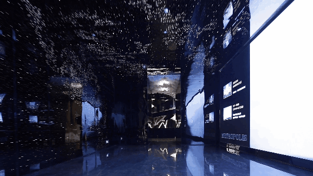 开放式影音区的廊道,灵感来源并且对标的是纽约第五大道。此处设置了大量LED屏幕,致力强调综合布区的商业氛围与科技感,为城南增加繁华人居体验。