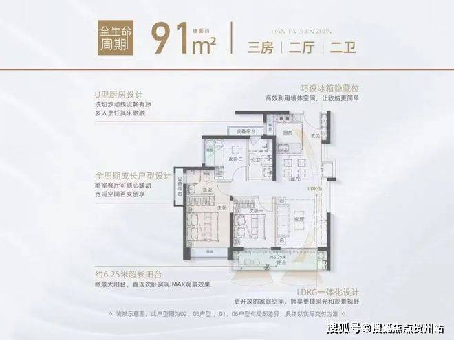 91㎡户型:折后总价:约550万-618万。特点:竖厅三开间朝南,客厅开间3.5米,卧室宽度分别为3米、2.75米、2.25米,U型厨房设计,南向超长阳台约6.25米。
