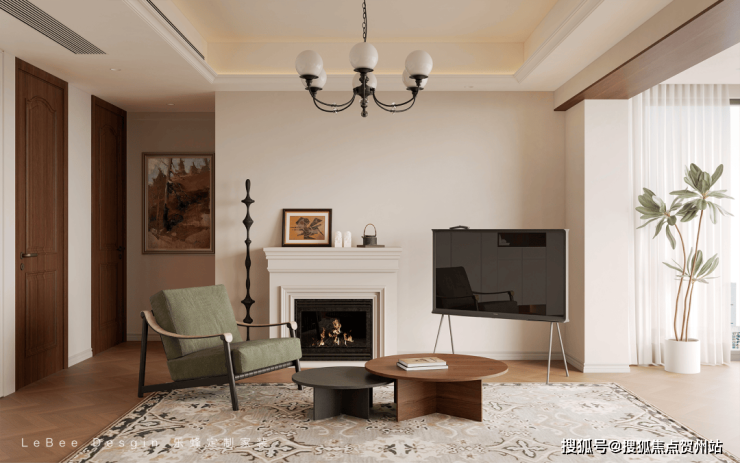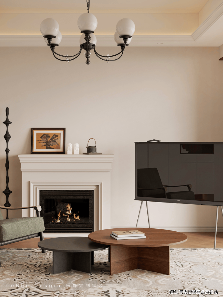 客厅摒弃传统电视背景墙,电视不上墙,移动电视更自由灵巧~电子壁炉简直是氛围感神器!跳动的光芒和温暖的色调让人感受家的温馨。