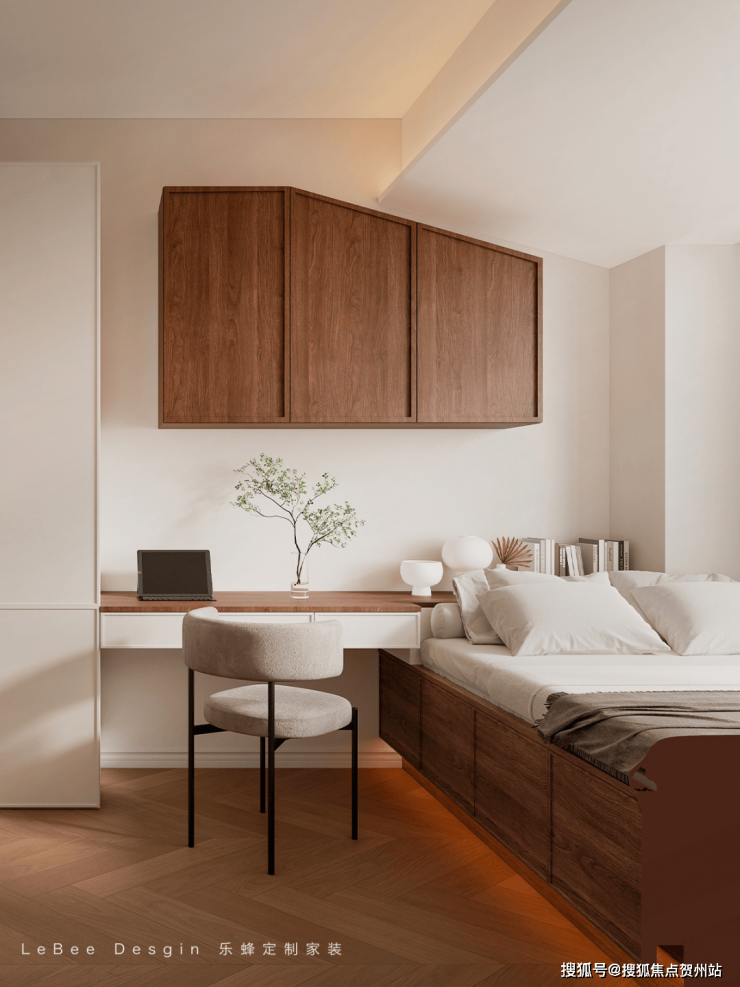 木质书桌与上方吊柜一体化设计,节省空间且实用,绿植与摆件增添生机与生活气息;搭配的椅子简约舒适。