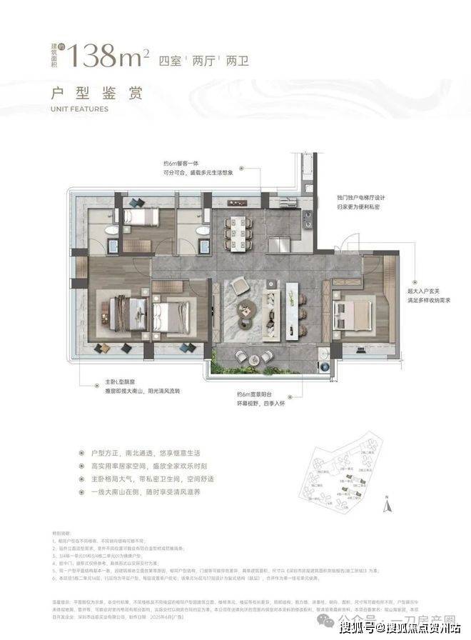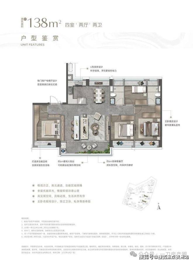入户玄关巧妙隔绝视线,隐私感拉满。客餐厅南北通透,大客厅除传统布局外,还增设茶台区域,两者共享 6 米多宽景阳台,搭配 U 型厨房与方正餐厅,公区气场全开。