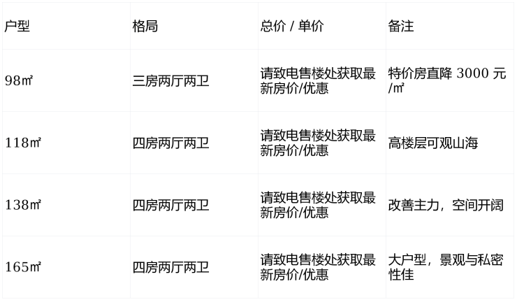 山海谷景观:三面凤凰山、高层瞰海,南北中轴排布,窗墙比大,LDKB 一体化设计,部分高楼层可同时观山海