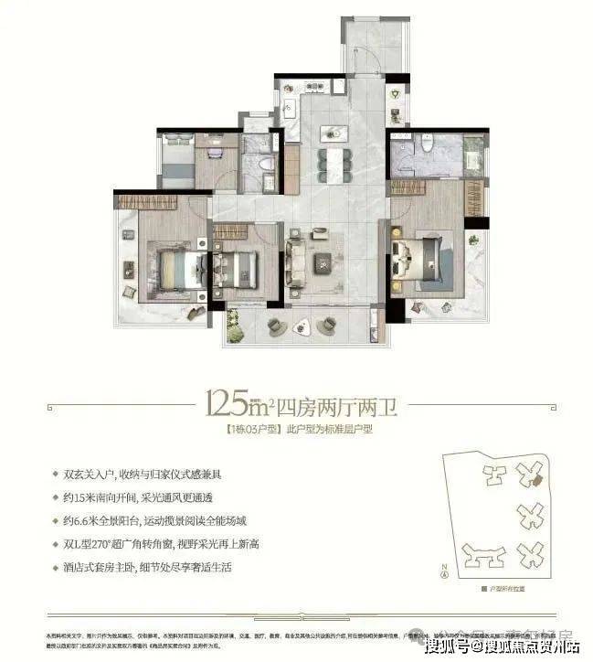 建面约125㎡户型,做到了双玄关入户+超大景观阳台+4开间约15米面宽+奢阔4+1房。
