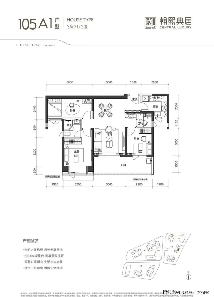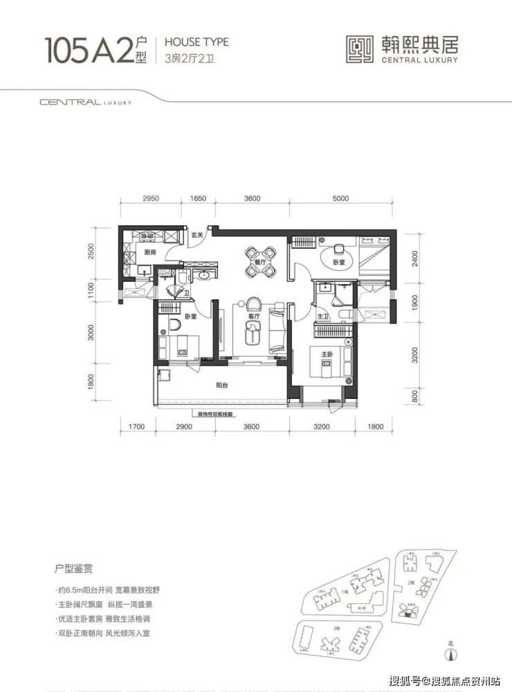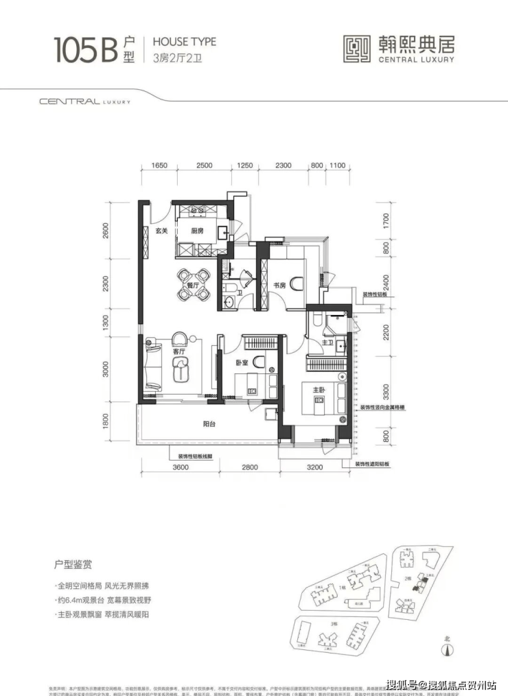 建面约105㎡的3房2厅2卫,经典的双龙抱珠布局,主人空间与客卧空间互不干扰,具备私密性优势。并且户型方正,实用三房两厅两卫。朝南向四开间面宽共约 13.2m,全明空间,采光极佳。这个户型含赠送半阳台和飘窗的面积后使用率可达约 83%,这在超高层中是比较高的使用率。