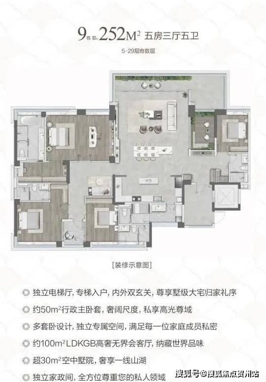 户型设计:主推 121-252㎡的四至五房,如 121㎡四房有 12 米奢阔面宽,三开间朝南;252㎡五房四套房设计,3.15 米层高,270° 无遮挡湖景。部分户型有 Low-E 玻璃幕墙、YKK 系统窗,隔音隔热性能好。