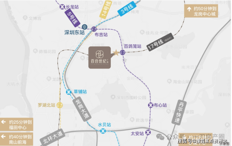 【交通】百合世纪广场紧邻地铁5号线百鸽笼站(步行约100米),且未来规划有17号线罗岗站约450米在此交汇通过地铁5号线,1站可换乘3/14号线,4站直达福田核心区,7站快速通达深圳北站。1 公里接驳龙岗大道,2.5 公里直达丹平快速。