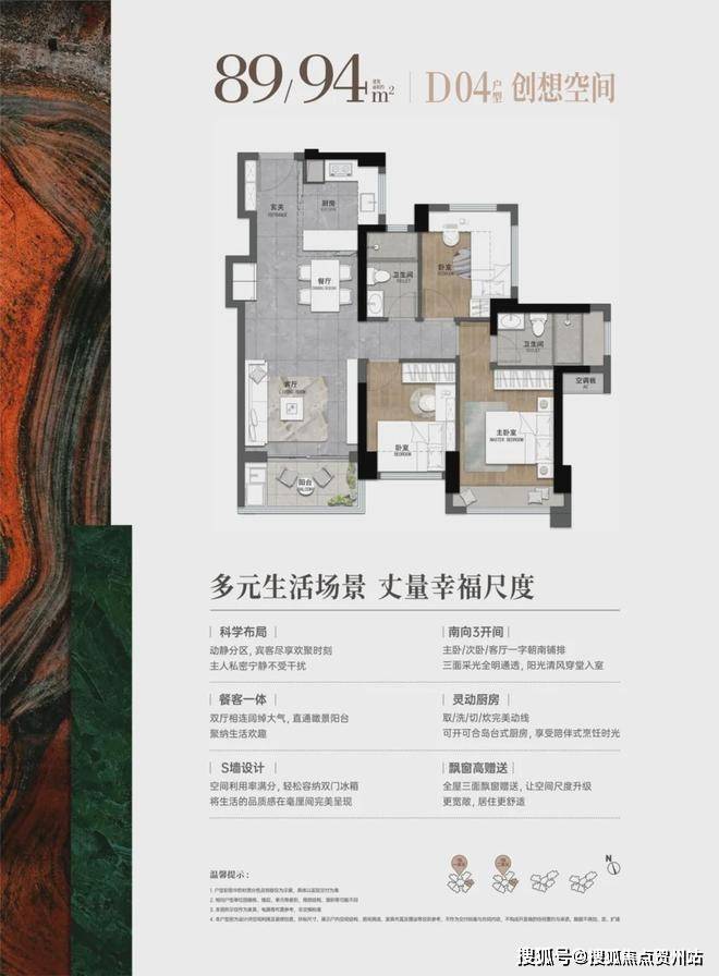 89-94㎡的4房2厅2卫,03.04户型,设计的是经典竖厅格局,进门入户玄关,客厅实测3.245米开间,LDKB一体化,S墙设计预留冰箱卡槽位,三开间朝南,3个卧室分别做到了主卧13.76㎡/次卧8.28㎡/次卧7.74㎡(实测面积,不含墙体),U型灵动式厨房,卫生间干湿分离,得房率约76.59-80.22%(不含赠送),东南朝向。