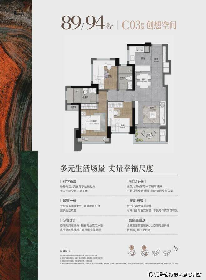 83-87㎡的3房2厅2卫,设计的是经典竖厅格局,客厅实测3.14米开间,LDKB一体化,S墙设计预留冰箱卡槽位,三开间朝南,3个卧室分别做到了主卧10.8㎡/次卧8.65㎡/次卧6.28㎡(实测面积,不含墙体),U型灵动式厨房,卫生间干湿分离,得房率约76.59-80.21%(不含赠送),西南朝向。