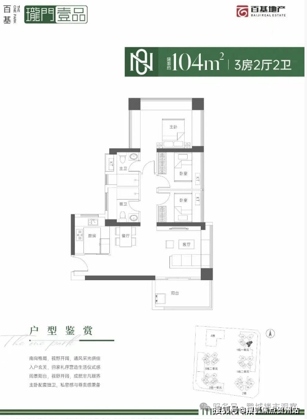 104㎡的3房2厅2卫,设计的是经典竖厅格局,进门入户玄关,客厅4.375米开间,LDKB一体化设计,动静分区,四开间朝南,主卧三面飘窗,U型厨房,卫生间干湿分离,得房率:71.29%(不含赠送),西南朝向。