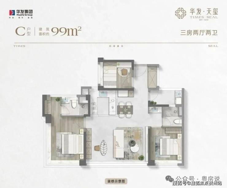 约99㎡3+1房两厅两卫:约35㎡LDKB厅餐客一体化设计,可变双套房;270°无遮挡视野,室内空间通透