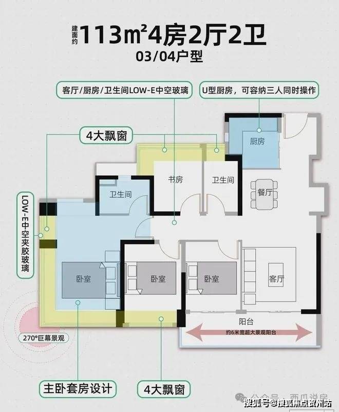 其中03/04户型113平户型,点赞率很高,拓展后使用率高达96%,大飘窗多,客厅阳台+主卧+次卧均南向,采光通风景观优秀。