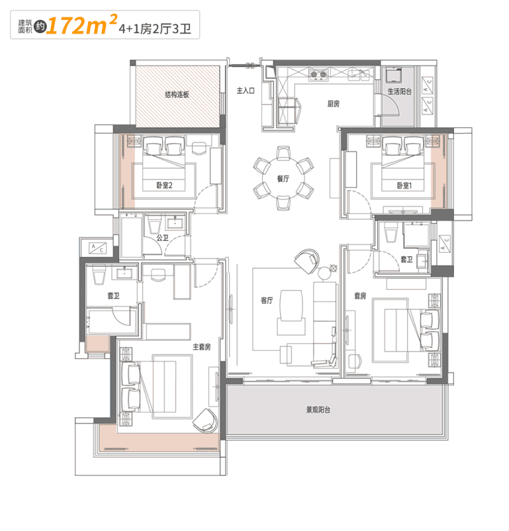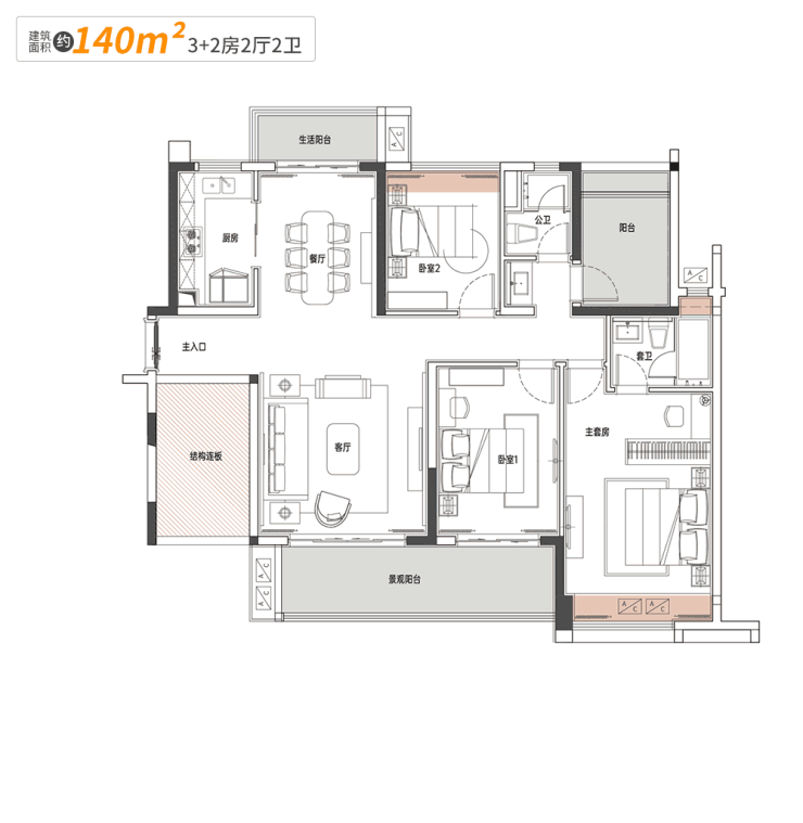 南北双阳台的打造,四开间朝南与短进深、大开间的设计,令整个户型共有3+2的空间。