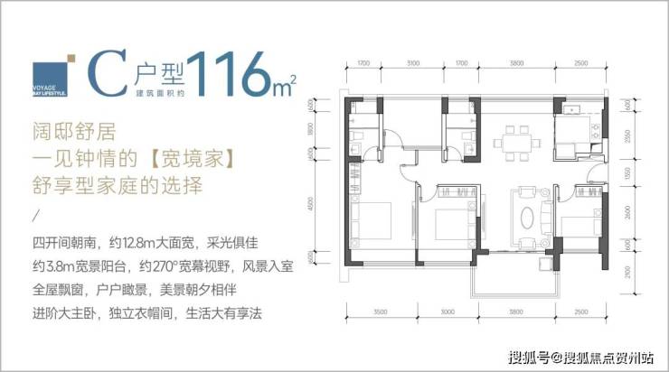 116㎡4房2卫C户型,竖厅南北通透格局,类似双龙抱珠,客厅3.8米开间,四开间朝南,阳台主朝西南、东南或正南向。