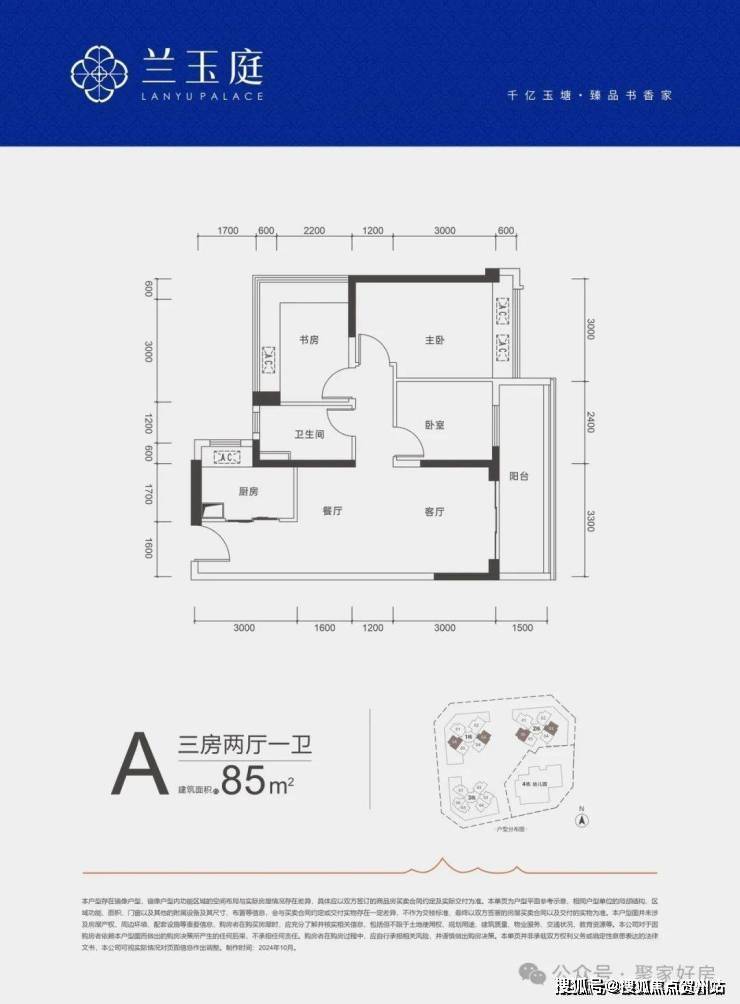 85㎡的3房2厅1卫,A户型,设计的是竖厅格局,客厅开间3.3米,LDKB一体化,三开间朝南,3个卧室分别做到了3米/2.8米/2.4米的宽度,客厅连接次卧出5.7米长的大阳台,L型厨房,得房率约79%(不含赠送),西南或东南朝向。