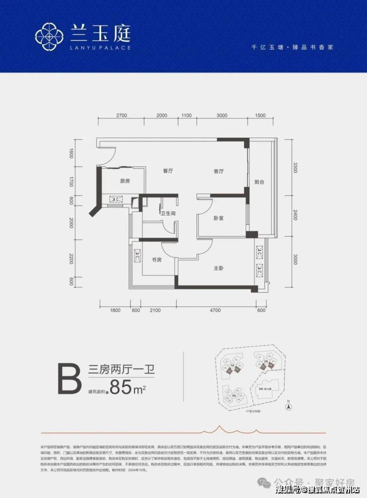 85㎡的3房2厅1卫,B户型,设计的是竖厅格局,客厅开间3.3米,LDKB一体化,三开间朝南,3个卧室分别做到了3米/2.7米/2.4米的宽度,客厅连接次卧出5.7米长的大阳台,L型厨房,创新式三分离卫生间,得房率约79%(不含赠送),西南或东南朝向。