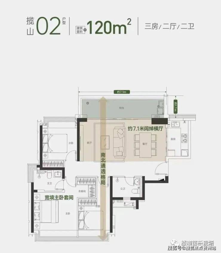 此次推售的1栋全是120㎡的三房两卫,两梯三户。