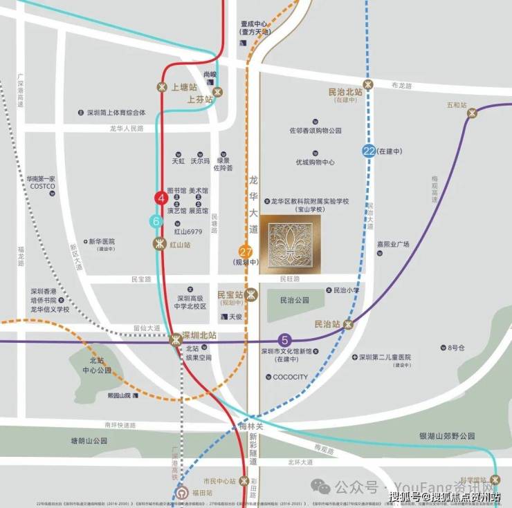 l 深圳北站高铁枢纽、地铁4/5/6号线已开通,22号线在建中,27号线规划中,已进入招标阶段,深大城际和深惠城际在建中,项目距离深大城际民治北站约900米,未来约20分钟到达机场,五地铁+二城际交汇环绕,五横六纵多维立体路网,无界城心繁华