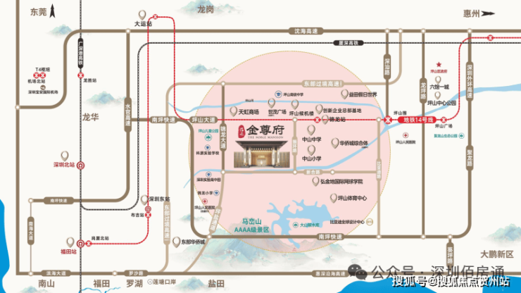 信达金尊府位于深圳坪山区中山大道及锦龙大道交汇处东南侧,处于坪山中心区辐射圈,借势深圳东进战略,紧邻碧岭沙湖生态腹地,自然环境优美。其地理位置优势显著,具体体现在以下几个方面: