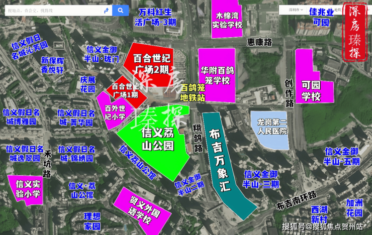 百合世纪广场,位于深圳市龙岗区布吉街道惠康路与翔鸽路交汇处,地处布吉核心板块百鸽笼片区,紧邻罗湖布心,是连接龙岗与罗湖的枢纽区域。项目北侧为万科红生活区,南侧毗邻荔山公园,直线1公里内覆盖求水山公园、围岭山公园等生态资源,形成“公园环绕”的居住环境。片区发展成熟,周边多为次新住宅小区(如信义荔山公馆、万科红等),居住氛围浓厚,且城市界面较布吉其他区域更为整洁,被誉为布吉的“豪宅区”。