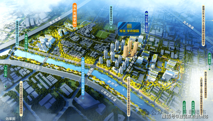 在项目茅洲河对岸,就是“中国科学院大学深圳医院(光明)新院”, 政府 投资 40 亿打造的三甲医院 ,未来将打造成区域医疗中心,是深圳市重点项目之一,预计 2025 年建成并投入使用。项目用地面积约 5 万平方米,总建筑面积为33.7 万平方米,可提供床位 1500 个,将有效缓解群众看病难的问题。