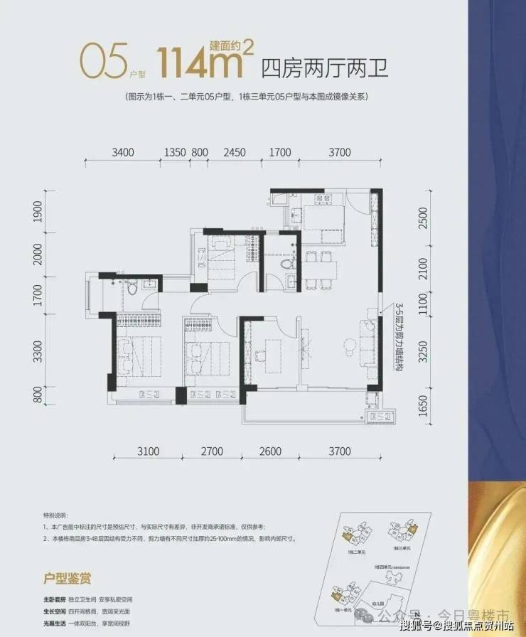 114㎡的4房2厅2卫 ,设计的竖厅格局,客厅3.7米开间,四开间朝南,4个卧室分别是3.1米/2.7米/2.6米/2.45米的宽度,客厅连接卧室带6.3米长大阳台,U型厨房,房,得房率:77.74%(不含赠送),有西南或东南朝向。