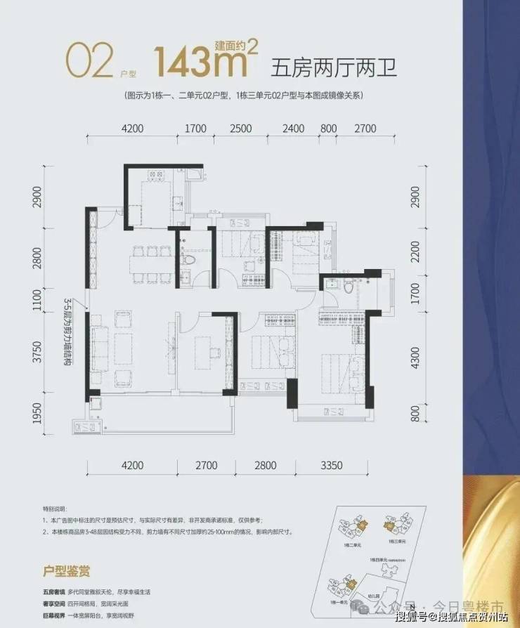 143㎡的5房2厅2卫 ,设计的竖厅格局,客厅4.2米开间,四开间朝南,5个房间分别是3.35米/2.8米/2.7米/2.5米/2.4米的宽度,客厅连接卧室带6.9米长大阳台,U型厨房,得房率:77.74%(不含赠送),有东南或西南朝向。