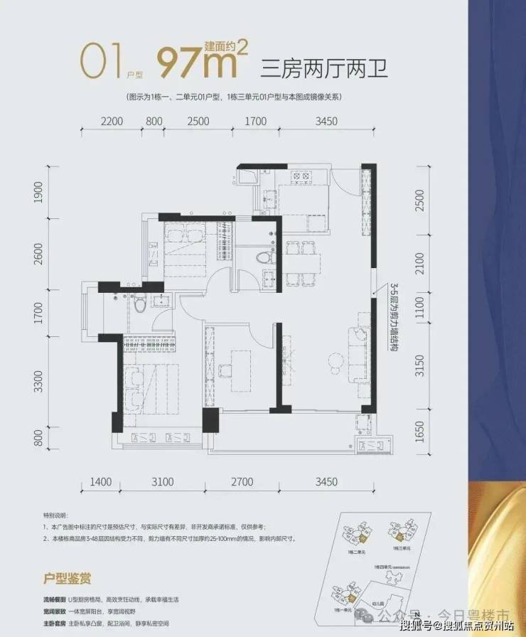 97㎡的3房2厅2卫 ,设计的竖厅格局,客厅3.45米开间,三开间朝南,3个卧室做到了3.1米/2.7米/2.5米的宽度,客厅连接卧室带6.15米长大阳台,U型厨房,得房率:77.73%(不含赠送),有东南向或西南朝向。